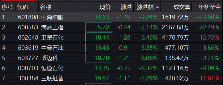 在A股市场,石油石化板块多只股票出现大跌。中海油服(601808)、海油工程(600583)、卫星石化(002648)、中曼石油(603619)等跌幅均超过5%。