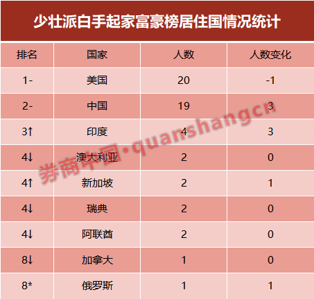榜单上38人的财富比去年有所增长,其中18人是新面孔。8人的财富比去年减少,另外7人财富保持不变。去年榜单上的10人今年落榜,其中7人是因为年龄超过40岁,3人是因为财富没能达到上榜门槛。胡润表示:“中国增加了8个新面孔,几乎是美国的三倍。印度增加了4个,同样领先于美国。他们平均用6年时间赚到第一个10亿美金。”