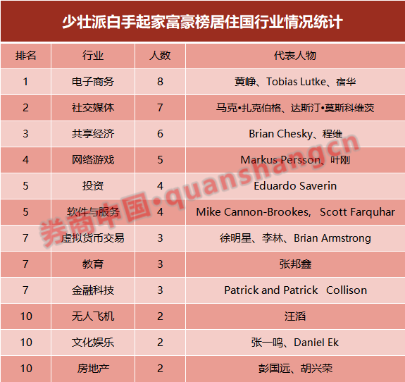 从行业分布上来看,电子商务和社交媒体创造了最多的80后10亿美金企业家,分别有8人和7人上榜;其次是共享经济和网络游戏。房地产行业仅有2人上榜,且均来自中国,近年来的地产行业萧条情况可见一斑。