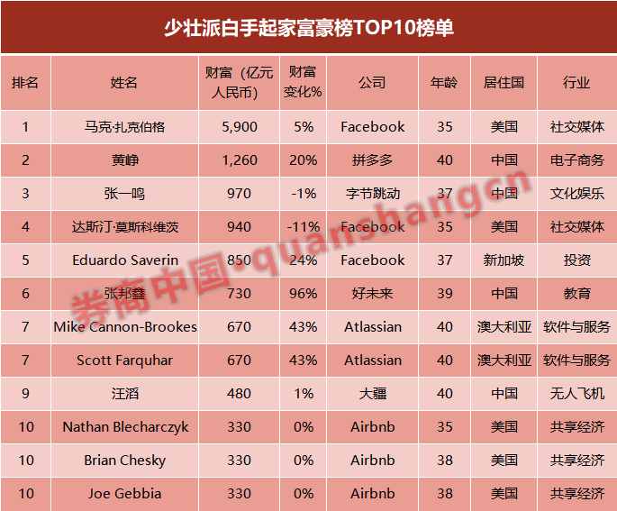 不过,相比之下,海外公司的造富效应更为明显。Facebook 35岁的马克•扎克伯格以5,900亿连续第五年成为全球80后白手起家首富。在过去的一年,扎克伯格财富增加500亿人民币,出售了价值超过5亿美元的股票。Facebook如今拥有超过25亿的用户,而扎克伯格现年仅有35岁。这也意味着,在巨大的财富差距下,在这份榜单中想要超越扎克伯格仍是相当困难。