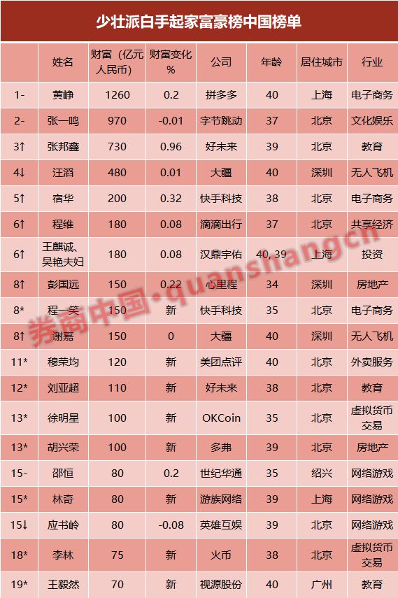 3月9日,胡润研究院发布《2020胡润全球少壮派白手起家富豪榜》(Hurun Global 40 & Under Self-Made Billionaires 2020),全球共找到53位40岁以下(含40岁)且白手起家的十亿美金企业家,其中19位来自中国。