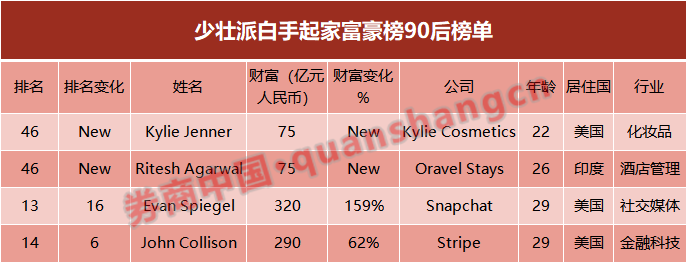 值得注意的是,95后已悍然杀入这份白手起家榜单。著名的卡戴珊家族一员凯莉·詹娜(Kylie Jenner)以75亿元的身家成为榜单中仅有的两位女性之一。胡润表示:“很难想到我们40岁以下白手起家企业家的榜单上都有4个90后,其中一个还是95后。”