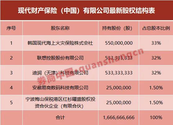 3月10日,银保监会官网挂出批文,批准现代财险注册资本从5.5亿元增至16.67亿元,此轮增资扩股引入4家新股东,联想、滴滴系公司迪润科技,以及另两家法人股东。联想和迪润科技将各自持股32%,并列第二大股东。至此,现代财险的性质也将由“外资”变为“中外合资”。