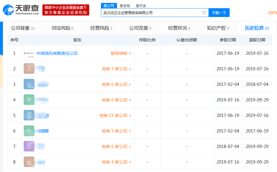 天眼查信息显示,中信信托曾在2017年6月参股远正咨询,于2019年7月退股,后续未有投资该企业的公开记录。