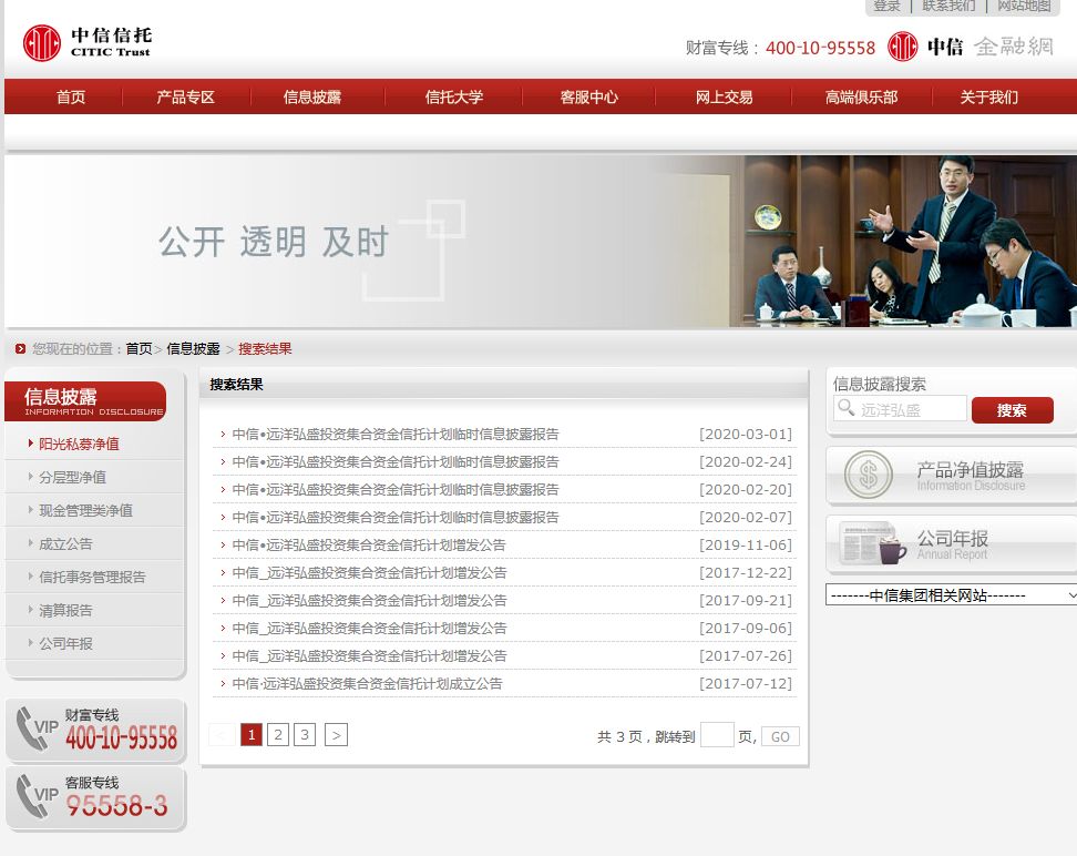 由于信托计划仅针对投资者进行披露,中信信托官网相关产品披露报告均需密码登陆,因此尚难以得知其披露内容。但从官网信息来看,在方正证券认购产品后至发现问题期间,中信信托曾发布两份事务管理报告,目前均已显示“404”。而在2020年2月后,中信信托就该信托计划连续发布5份临时信息披露报告,情况显然有变。