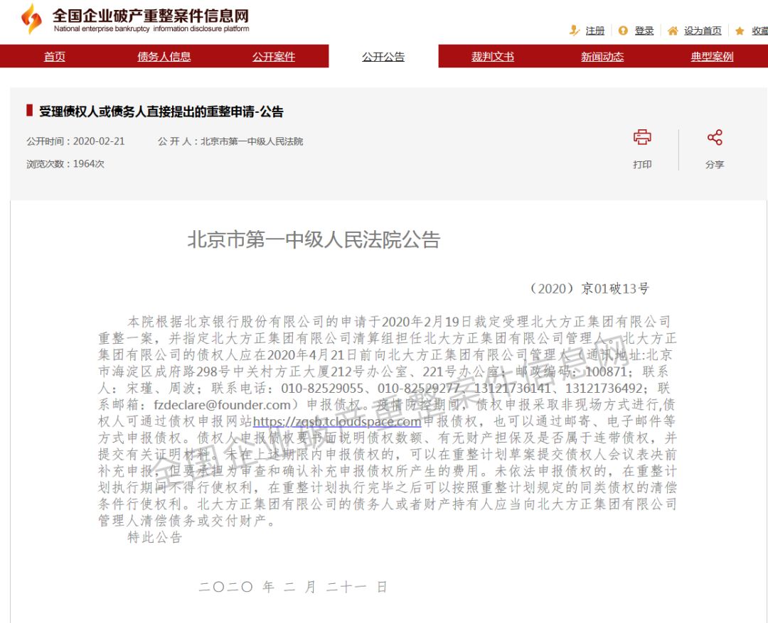 在这之前,方正集团宣称,债权人北京银行向法院申请重整。2月18日,方正集团旗下6家上市公司集体公告了该信息。随后,方正集团的重整申请被北京一中院受理,指定方正集团清算组担任方正集团管理人,方正集团清算组由人民银行、教育部、相关金融监管机构和北京市有关职能部门等组成。