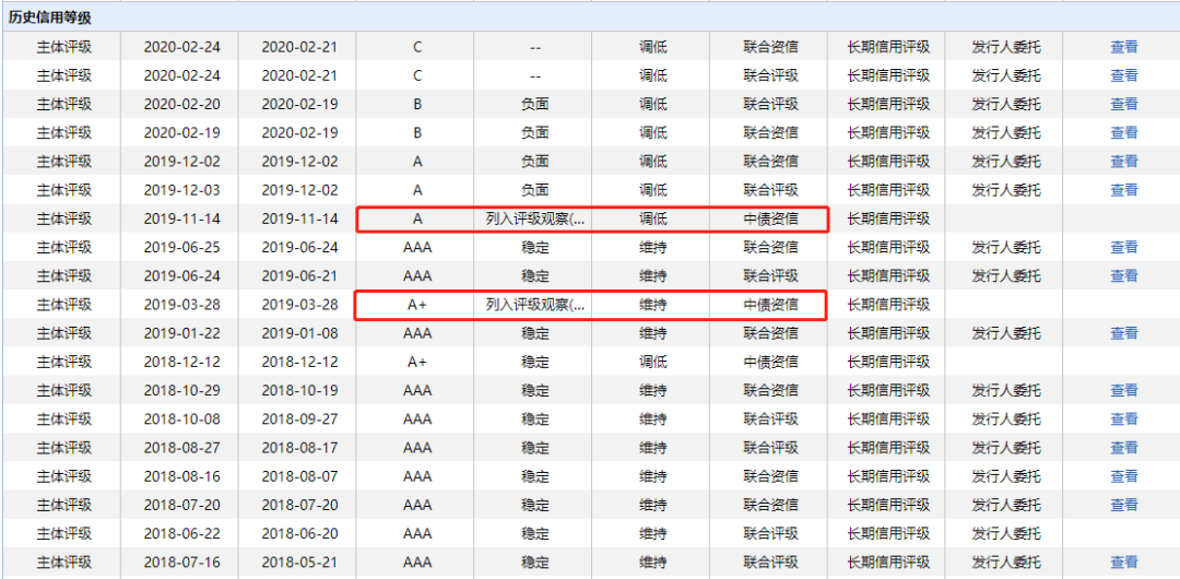 在联合资信发布的跟踪评级报告中指出,“联合资信关注到,公司债务规模增长快且债务负担很重”,并关注到“近三年,公司本部连续亏损,且亏损金额较大。”但出于“实体产业盈利能力有望提高”、“逐步剥离非主业相关业务”等理由,联合资信仍对其评级展望仍为稳定。而在2019年3月,中债资信已下调方正集团主体评级至A+,并列入评级观察。