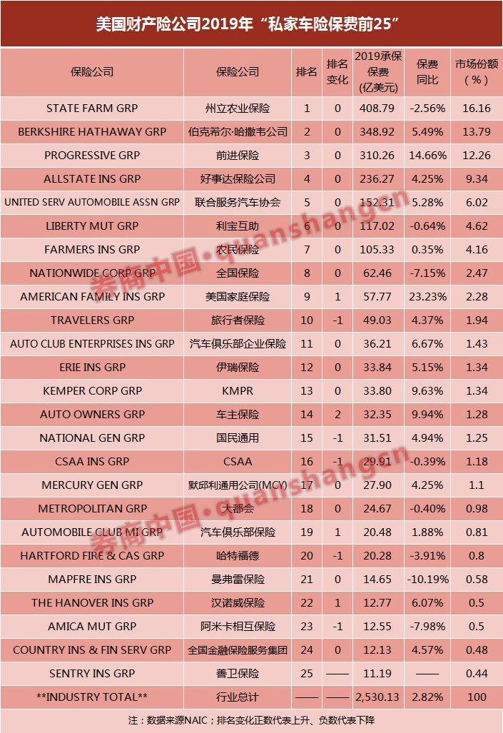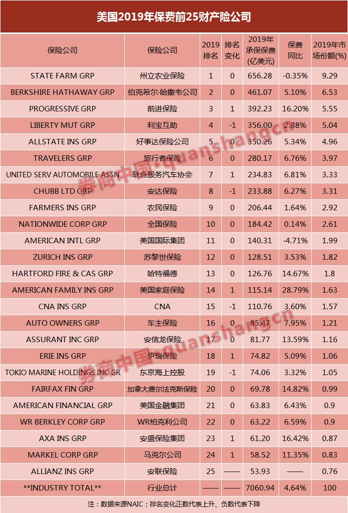 家财险:STATE FARM占18%份额居第1,伯克希尔未进入前25