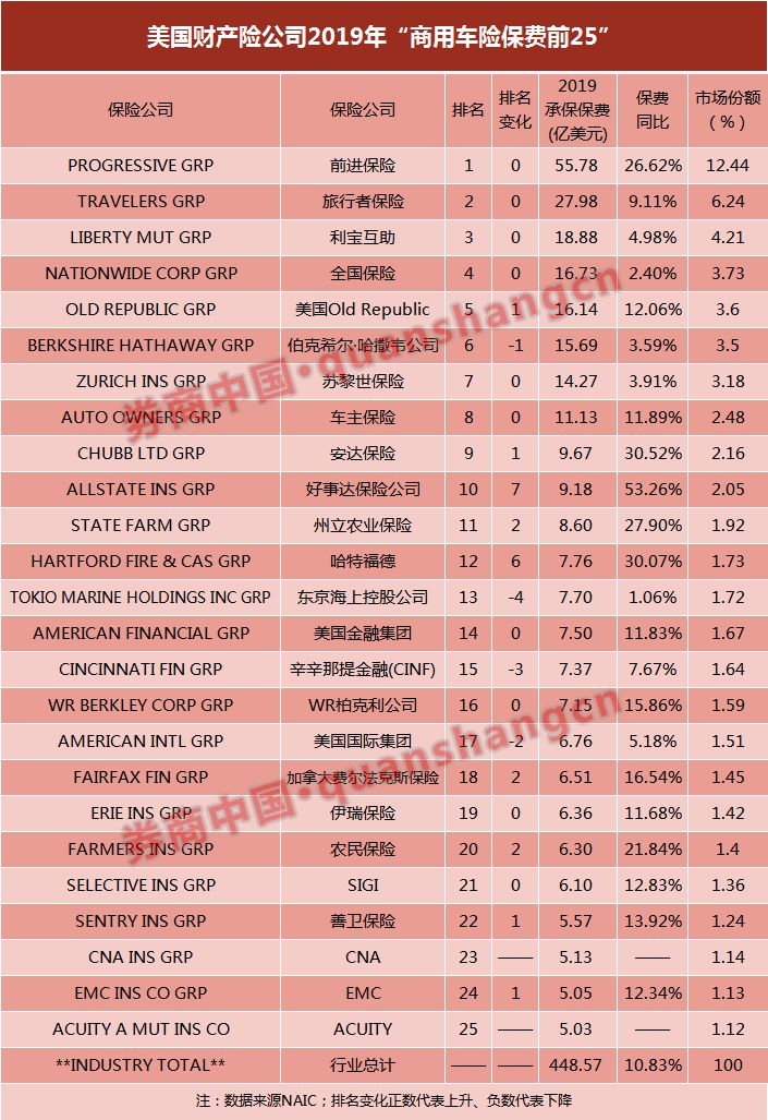 商用车险是车险的另一组成部分,美国商用车险2019年保费449亿美元,同比增速10.83%,增速在各类财险中较高。不同于私家车险,在商用车险这一业务上,各家财险公司有了全新排位。