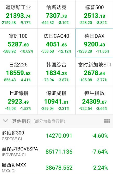 欧美多个国家股市出现历史性大跌,富时100指数、法国CAC40指数、德国DAX指数等盘中均跌超9%。墨西哥IPC股指盘中暂停交易十五分钟;加拿大多伦多证交所一度暂停股票交易,此前股指跌幅达9.2%,触发第一级全市场熔断;巴西IBOVESPA股指日内跌幅达12%,触发本周第三次熔断,之后巴西IBOVESPA股指跌幅达到15%,触发日内第二次熔断;欧洲Stoxx 600指数跌幅扩大至10%,创历史最大跌幅。