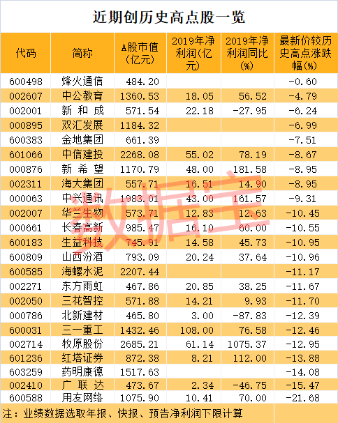 与历史高点相比,上述23股中用友网络、广联达、药明康德、红塔证券、牧原股份等回调幅度较大,其中用友网络回调幅度21.68%居首。此前受益于云计算产业链的爆发,用友网络在春节后一段时间持续大涨,3月4日盘中创下历史高点,之后持续震荡下行至今,A股市值回落至1076亿元。最抗跌的当属烽火通信、中公教育,两者回调幅度均不足5%。具体名单见下表: