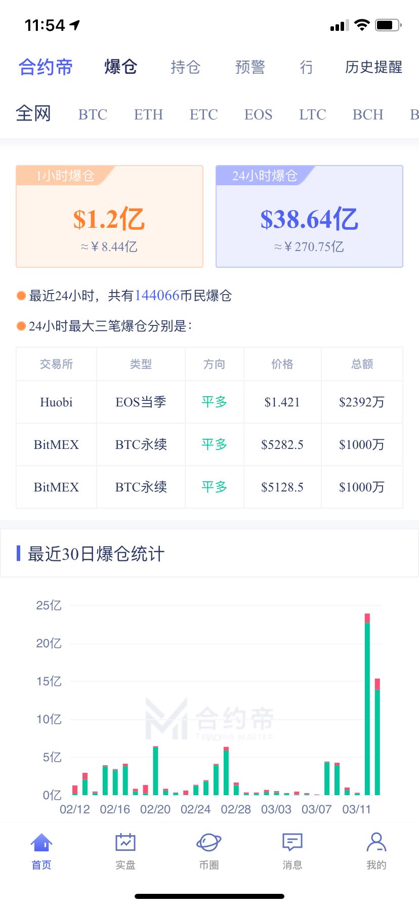 根据合约帝数据,目前比特币24小时爆仓27.36亿美元(折合人民币约191.81亿元);全网(含比特币、以太坊、莱特币、比特币现金等)24小时爆仓38.4亿美元(折合人民币约269.17亿元)。