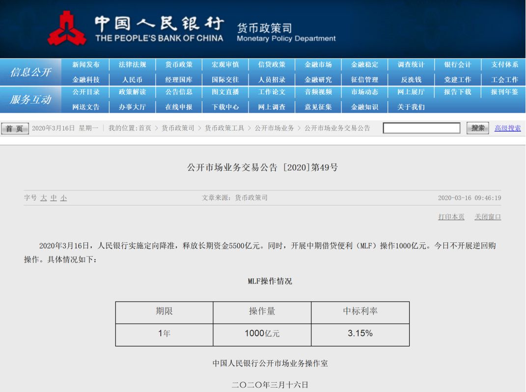 据央行官方网站公告,3月16日,中国人民银行实施定向降准,释放长期资金5500亿元。同时,开展中期借贷便利(MLF)操作1000亿元。今日不开展逆回购操作。