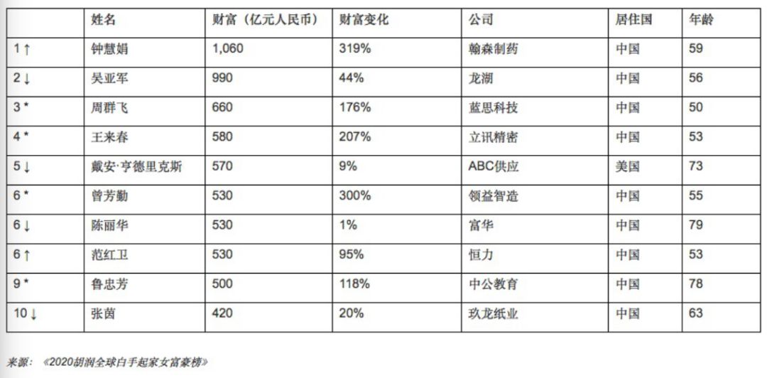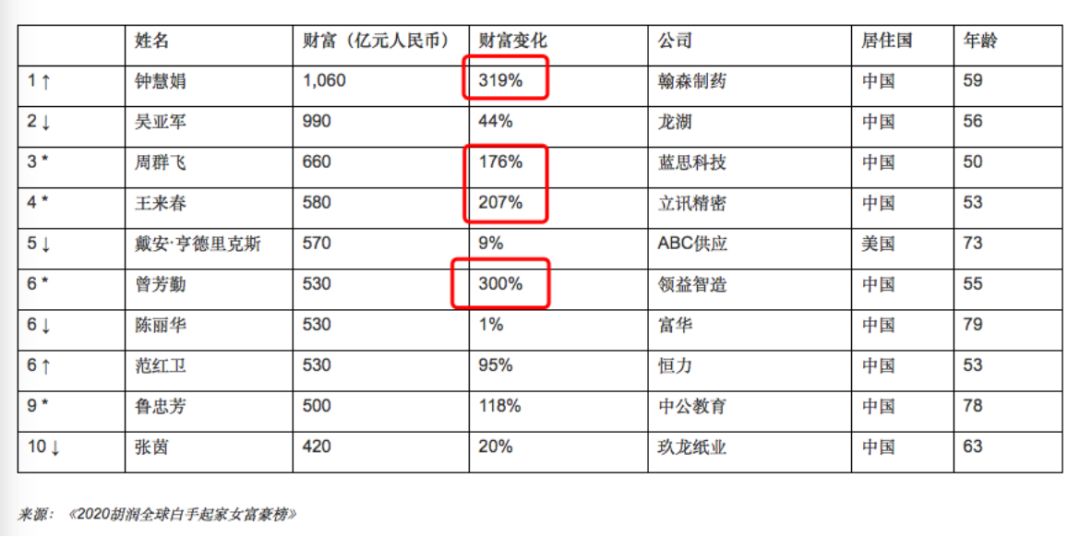 此外,新兴产业的造富速度,也在加快。本榜单中,财富涨幅最大女富豪的包括翰森制药59岁的钟慧娟、“玻尿酸女王”华熙生物54岁的赵燕、领益智造55岁的曾芳勤、立讯精密53岁的王来春、和蓝思科技50岁的周群飞。