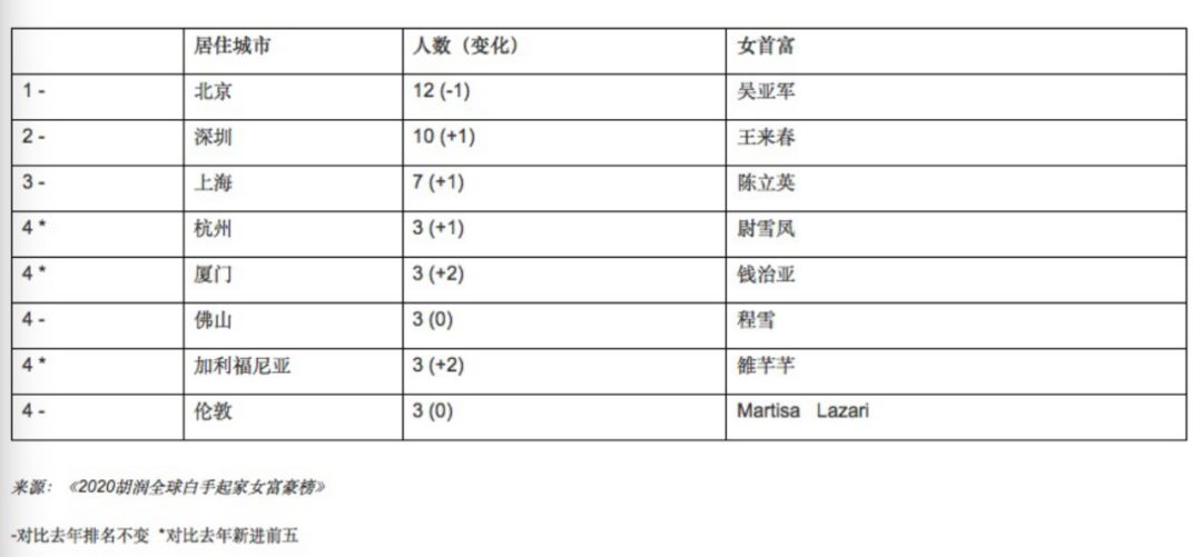 分城市来看,中国的北京、深圳和上海仍然是“全球白手起家女企业家之都”。北京以12名的富豪数量居第一名,深圳诞生10位富豪,紧随其后。上海诞生7位富豪,超过第四名城市一倍。