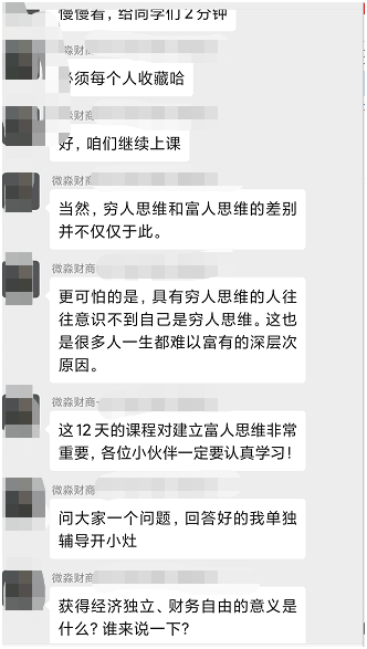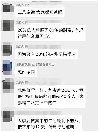 H培训师继续介绍,微淼商学院纯粹就是理财教育商学院,不卖保险,也不卖理财产品,只是一个培育机构,学员通过报名进行课程培训。接下来,H培训师便在群里提问“为什么只有20%的人掌握了80%的财富”。随后,其再通过所谓的二八定律对此解释,“就像群里一样,200多人的群,但坚持到最后继续学习的可能就只有40人,这就是二八定律中的二。大家要做其中的二还是剩下的八,接下来的12天,请用行动证明。”