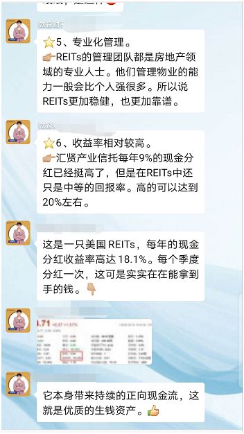 此外,培训师还经常在微信群里推荐收益率很高的理财产品,比如海外REITs房地产信托基金,Y培训师在群里称,REITs收益率非常高,“大家看XXX信托每年9%的现金分红已经很高了,但是在REITs中还只是中等的回报率,高的可以达到20%左右。”