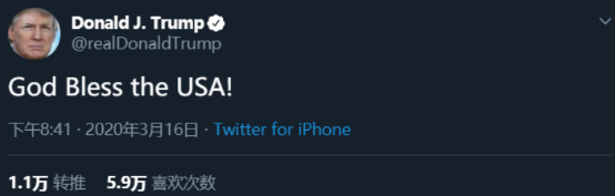 而就在美股开盘前50分钟,特朗普发布了一条推特:愿上帝保佑美国!没想到50分钟后,美股再次熔断,暂停交易15分钟。