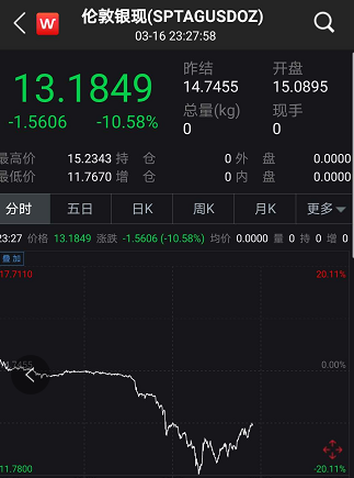 晚间现货白银迅速崩盘,伦敦银现跌幅一度超过20%,失守12美元/盎司关口。随后黄金也开启崩盘模式,一度跌破1460美元/盎司,较日内高点跌逾100美元。