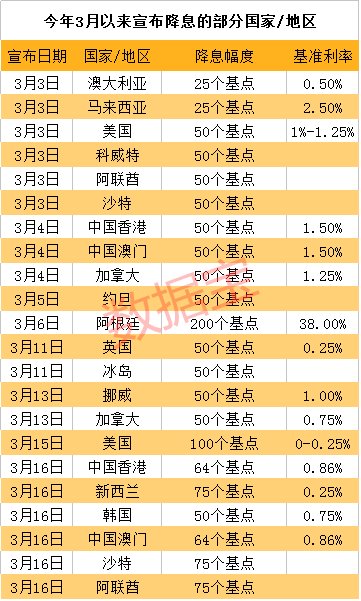 继美联储再次启动紧急降息,调降基准利率100个基点至0~0.25%后,昨天白天新西兰、香港、澳门、韩国、沙特、斯里兰卡、卡塔尔等地央行也相继宣布了降息政策。