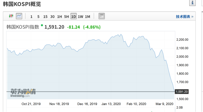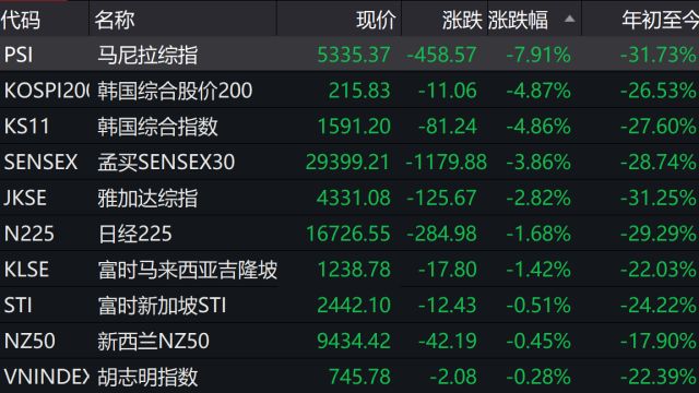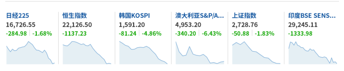 但午后13点之后,两大市场指数先后翻绿,跌幅不断扩大,其中韩国KOSPI指数收盘下跌4%,跌至自2010年以来最低水平。日经225指数收盘跌1.68%,报16726.55点。