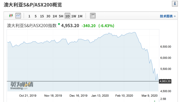 而经历昨日大涨的澳洲股市今日却率先走跌,澳大利亚S&P/ASX200指数午后跌幅扩大至超7%,已经抹去昨日全部涨幅。