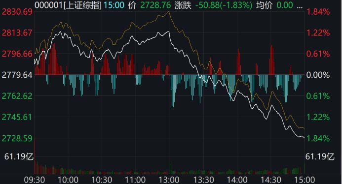 而到午后开盘,三大指数冲高回落。其中上证综指再度失守2800点,指数翻绿。截至当日收盘,上证综指报收2728.76,跌1.83%。