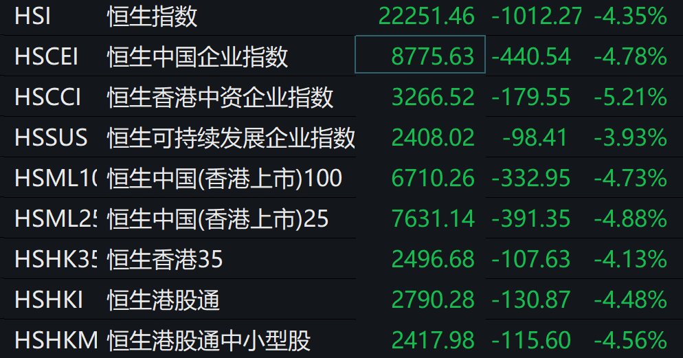 当天,港股市场同样集体走跌,午后恒指跌幅一度扩大至2%以上,汽车、能源等板块领跌。恒生指数临近尾盘跌幅逼近5%。