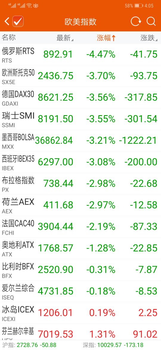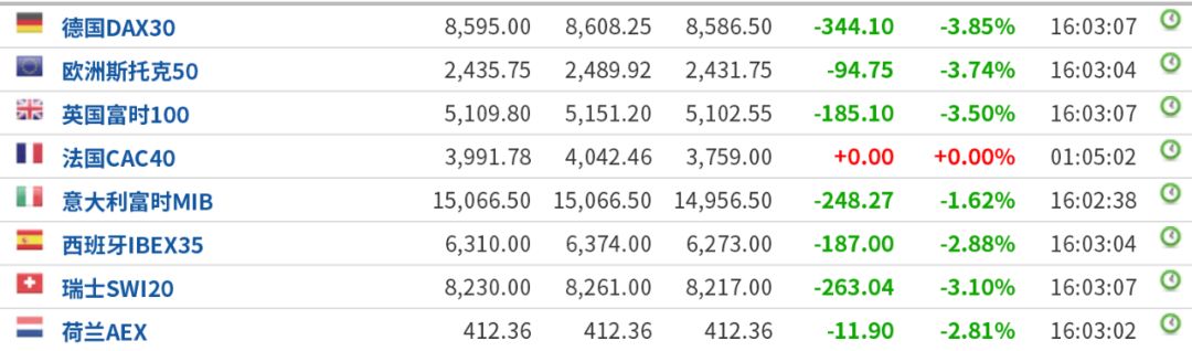 下午四点,欧洲股市全线大幅低开,英国富时100指数跌3.17%,德国DAX指数跌3.89%,欧洲斯托克50指数涨跌3.61%。