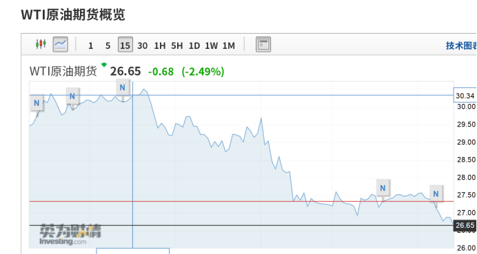 原油持续暴跌,WTI原油暴跌至26.20美元,跌破2015/2016年的油价低点,刷新2003年5月以来低位。