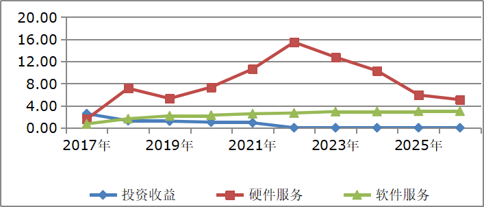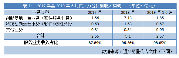 2017年到2019年6月底,力合科创分别实现2.56亿元、9.1元、2.57亿元营业收入,其中“软硬”两项服务业务占比超过85%,是其主要的收入来源(表1)。