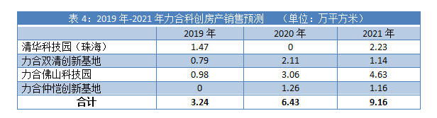 根据力合科创的预测,2019-2021年销售面积将达18.83万平方米(表4),2022年销售面积预计在10万平方米左右,剩余约20万平方米将会被用作出租或后续年度出售。
