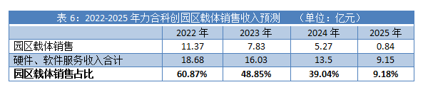 力合科创认为,虽然表面上看起来是房地产销售,但其定位仍是为投资服务业务提供支撑,销售的对象具有特定性,主要目的是聚集更多科技、产业资源,吸引更多的企业入驻园区,以便获得更多的服务业务收入。并且,其房地产项目建设还获得了国开行政策性资金支持。在估值上,力合科创也对2022年之后的房产销售收入做出逐年下降的预测,2026年预测值直接归0(表6)。