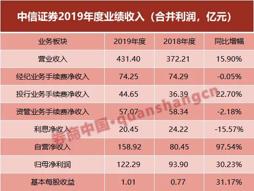 今年1月份,中信证券发布的业绩快报显示,2019年度,公司证券投资业务和投行业务收益同比增长。而从年报来看,这两项业务确实是增幅最为明显的板块。