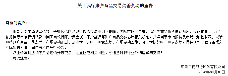 工行表示,受此影响,参照国际市场报价及市场流动性状况,该行将灵活调整账户商品交易点差:市场波动加剧、流动性不足时,调宽点差;市场波动回稳、流动性恢复时,调窄点差。