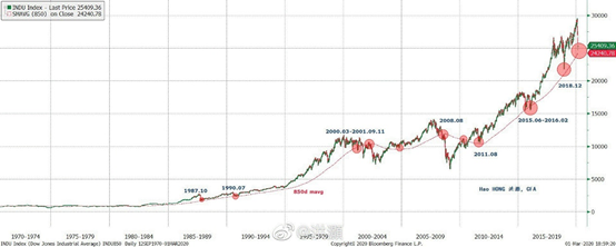 康主编注:洪灏曾经简单阐述过850天均线对于判断美股走势的意义。简单地说:850天均线=3.5年x12月x20.2交易日约等于一个经济短周期;它是美股长期上升的趋势线,只有在美国经济危机时才会跌破。即使是1987.10黑色星期一的历史性暴跌,也在850天均线上获得支持。2008年8月,在雷曼倒闭前夕,道指才跌破这条均线,而后头还有2/3的跌幅。这次历史性的暴跌再次在850天均线上找到支持。