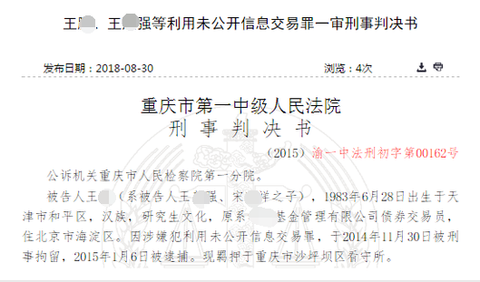 案例通报显示,2015年12月18日,重庆市人民检察院第一分院以利用未公开信息交易罪对王某、王某强、宋某详提起公诉。重庆市第一中级人民法院公开开庭审理此案。