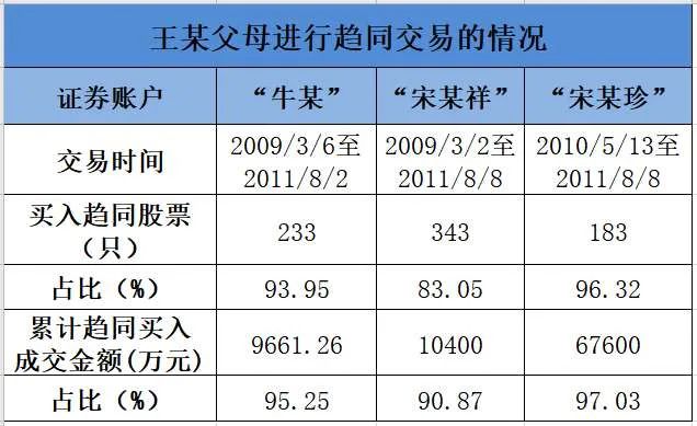 其母亲宋某详操作的宋某祥证券账户,在2009年3月2日至2011年8月8日期间,买入趋同股票343只、占比83.05%,累计趋同买入成交金额1.04亿余元、占比90.87%。