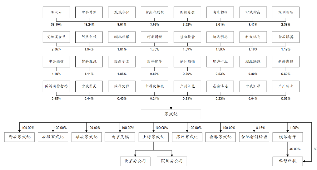 招股书显示,发行上市前寒武纪共有32名股东,陈天石外,中科院所属公司中科算源、寒武纪员工持股平台艾溪合伙、古生代创投、国投基金等分列寒武纪第二至五大股东,持股比例分别为18.24%、8.51%、3.93%、3.92%。