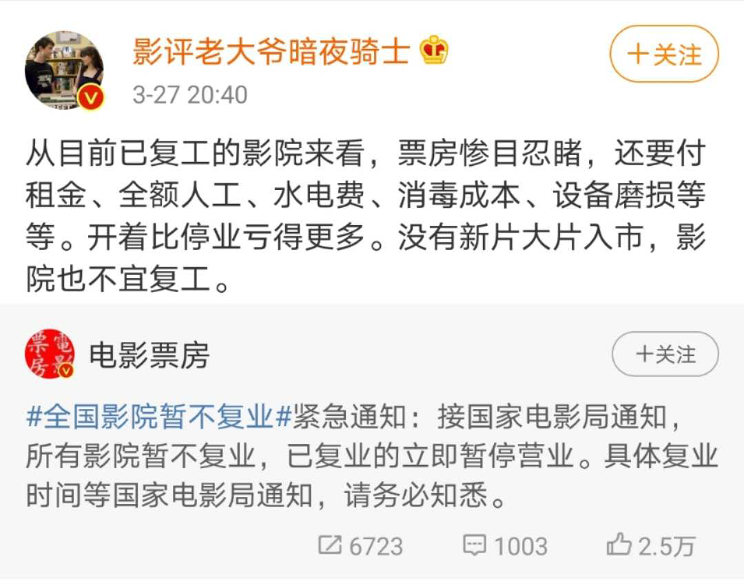知名影评人表示,从目前已经复工的影院来看,票房低迷,覆盖不了人工水电,消杀防疫以及设备磨损等成本,没有新片大片的输入,影院暂时不宜复工。