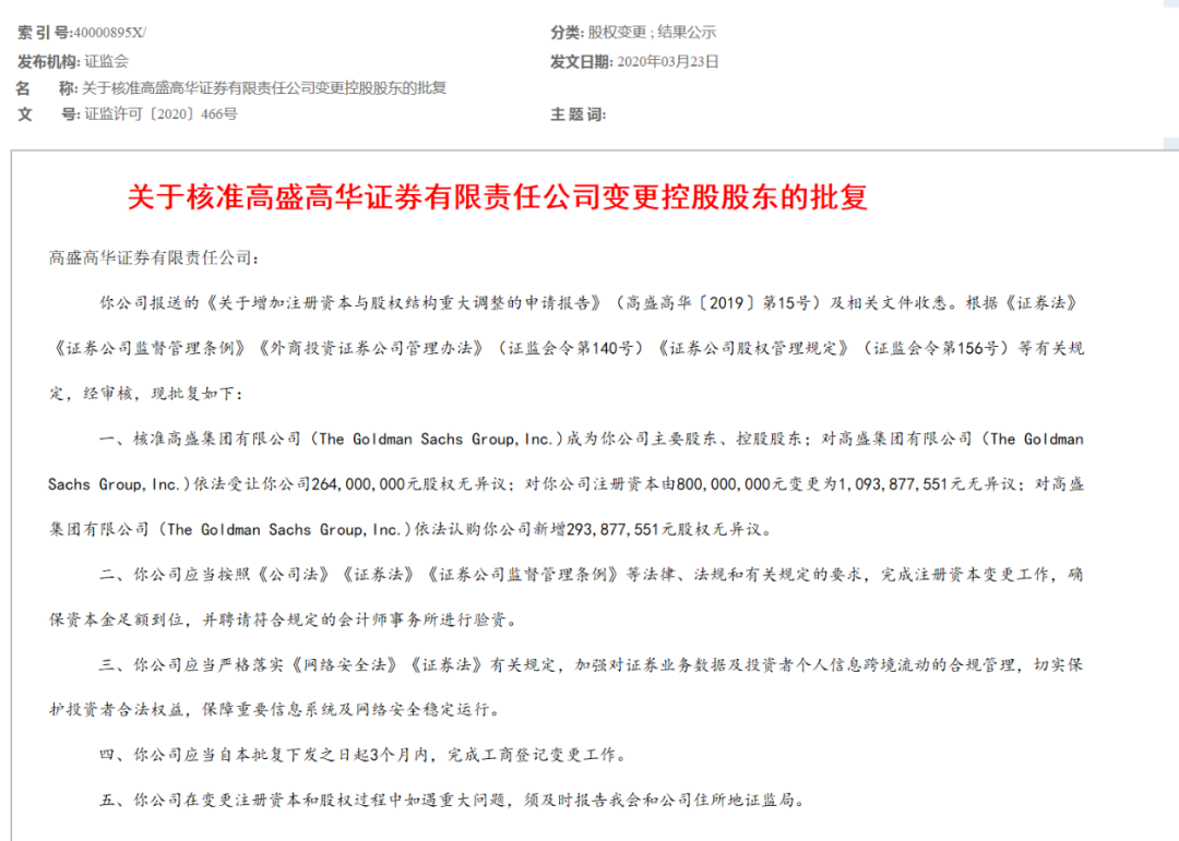 证监会27日发布了《关于核准高盛高华证券有限责任公司变更控股股东的批复》,核准高盛集团成为高盛高华控股股东,对高盛集团受让高盛高华2.64亿元股权无异议,对高盛高华注册资本由8亿元变更为10.94亿元无异议,对高盛集团认购高盛高华新增2.94亿元股权无异议。