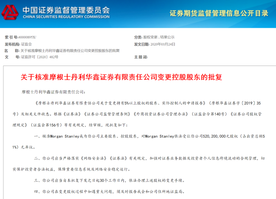 证监会发布的行政许可事项显示,核准Morgan Stanley成为摩根士丹利华鑫证券控股股东,对其依法受让公司5.2亿元股权(占出资总额51%)无异议。摩根士丹利华鑫证券应自批复下发之日起30个工作日内,办理上述股权变更手续。