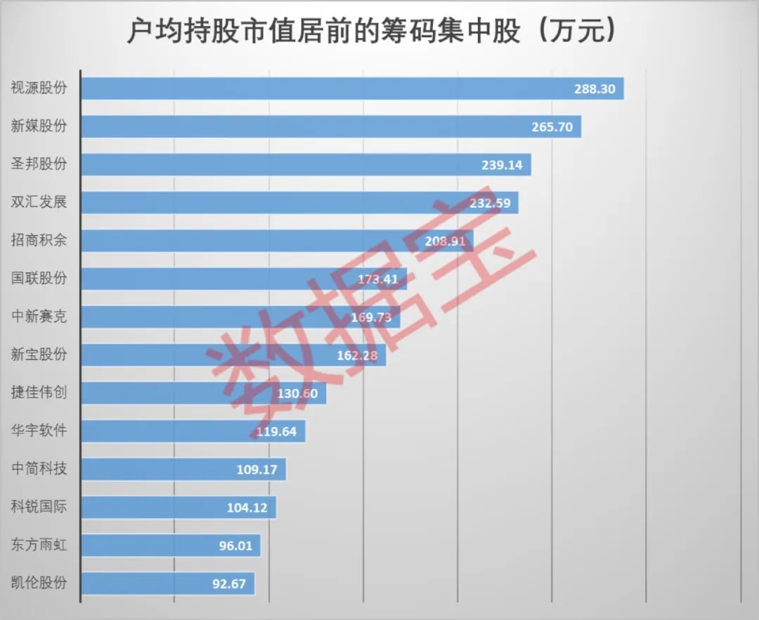 从筹码集中股的户均持股市值来看,有12股的股东平均持股市值超过百万元。视源股份的股东平均持股市值288.3万元位居第一,其他户均持股市值较高的还有新媒股份、圣邦股份、双汇发展、招商积余,都超过了200万元。