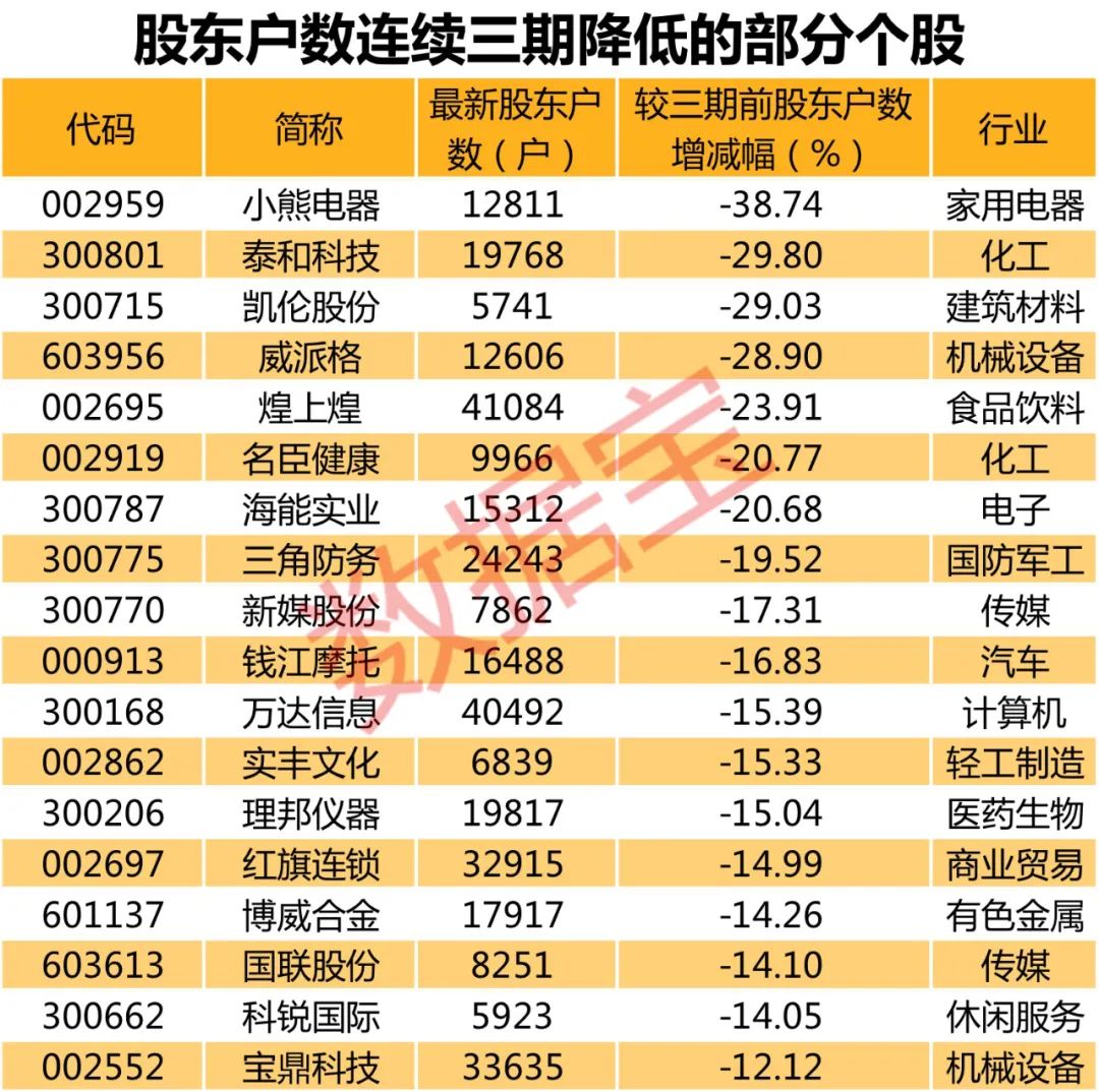 数据宝统计,股东户数连续三期下降个股有61只。小熊电器降幅最大,最新股东户数为12811户,相比三期前下降38.74%;其次为泰和科技,相比三期前股东户数下降29.8%;其他股东户数降幅较大的还有凯伦股份、威派格、煌上煌、名臣健康等。