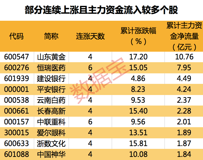 值得注意的是,291只连续上涨个股中,25只个股期间主力资金累计净流入超过亿元。其中,累计资金流入最多的为山东黄金,主力资金累计流入10.76亿元。