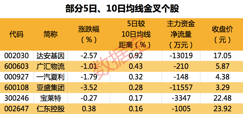 截至3月27日收盘,有6只A股的5日均线主动上穿10日均线,其中达安基因、广汇物流、一汽夏利等个股的5日均线较10日均线距离最大,分别达0.92%、0.43%、0.32%。