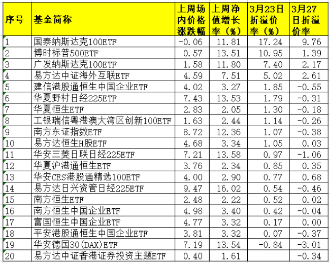 以国泰纳斯达克100ETF为例,上周该只基金,基金净值从1.5782元至1.7638元,区间涨幅11.8%,而场内溢价率从10.95%降至1.39%,场内价格微跌0.06%。
