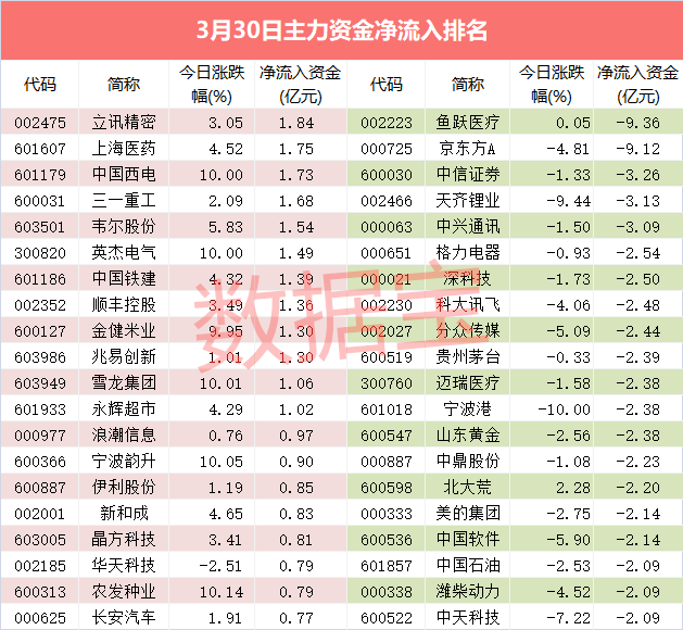 单只股票来看,仅12股主力资金净流入逾亿元,立讯精密、上海医药、中国西电净流入规模居前三。消费电子概念龙头立讯精密单日净流入1.84亿元居首,该股今日尾盘收涨3.05%。上海医药主力资金净流入1.75亿元,今日上涨4.52%。中国西电主力资金净流入1.73亿元,股价涨停。净流入规模较大的还有三一重工、韦尔股份、英杰电气、中国铁建、顺丰控股等。