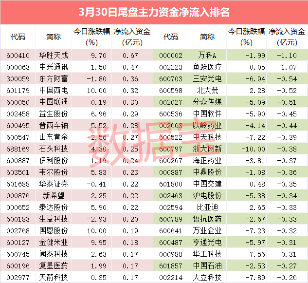 尾盘主力资金净流入最高的是华胜天成,净流入资金0.67亿元。中兴通讯、东方财富尾盘主力资金净流入分别为0.47亿元、0.36亿元,股价分别下跌1.5%、1.8%。尾盘主力资金净流入大的还有中国西电、中国联通、益生股份、晋西车轴、山东黄金等。