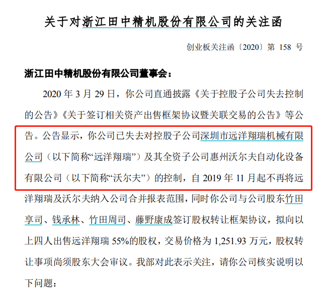 3月30日,深交所关注函飞驰而至,针对田中精机对并购资产的整合、此前隐瞒子公司失控风险、出售股权是否符合重大资产重组、董监高是否存在内幕交易等问题尖锐提问。